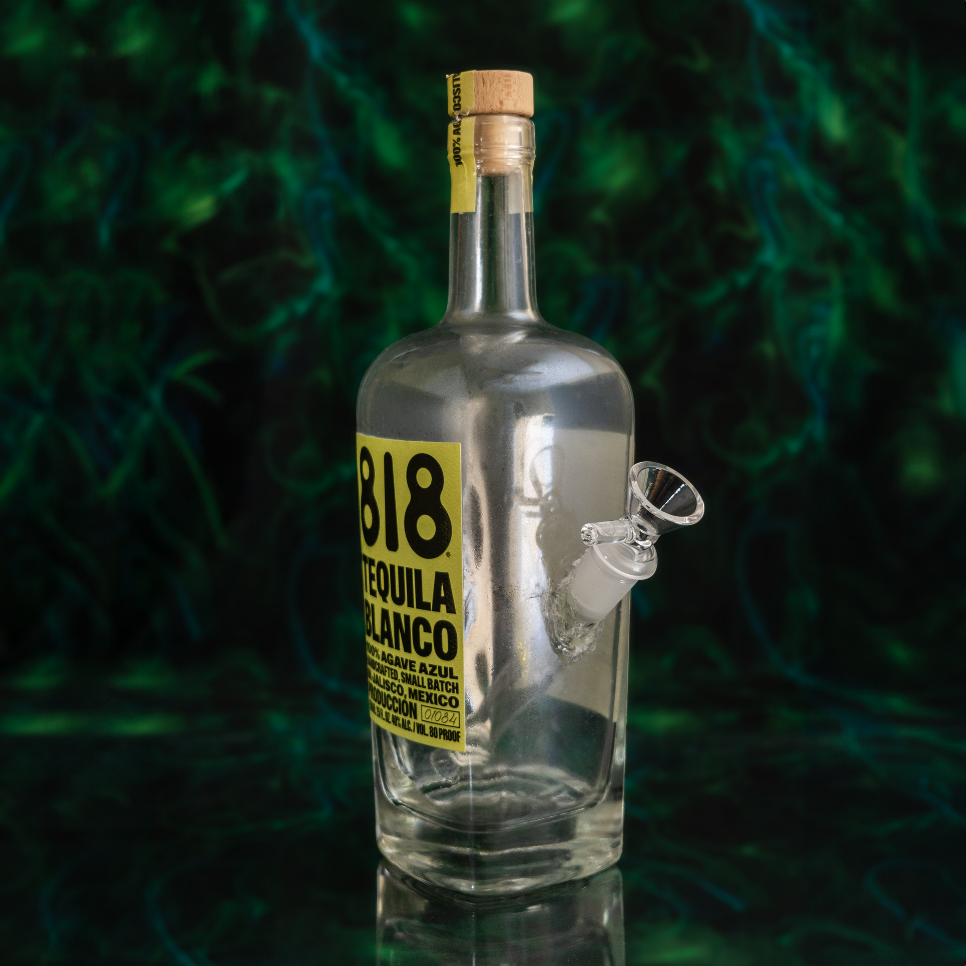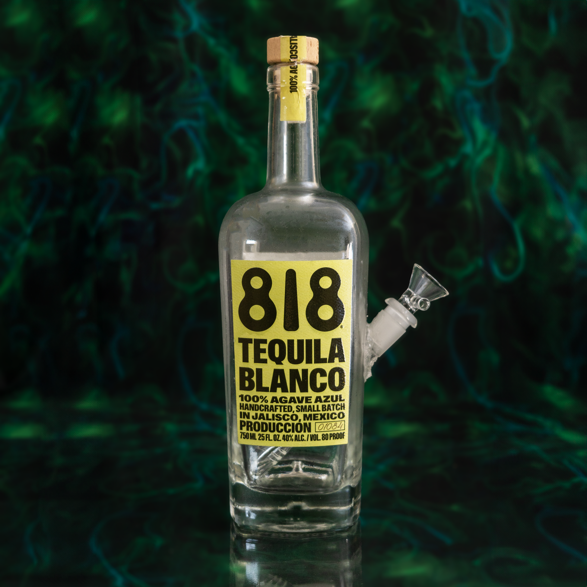This 818 Tequila Blanco bottle is reimagined into a striking bong, blending the clean, minimalist design with modern smoking culture. Its elegant glass and refined shape create a functional piece that elevates both style and experience for tequila and cannabis enthusiasts alike.